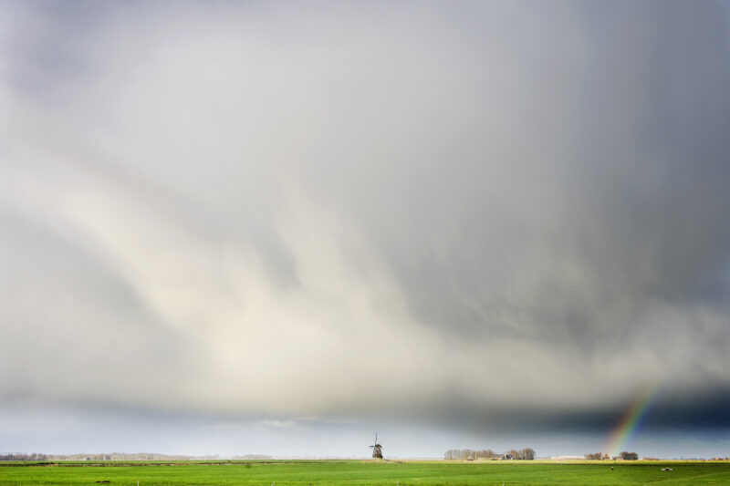 Regenwolken en een regenboog boven molen “De Hoop” bij Readtsjerk. FOTO: MARCEL VAN KAMMEN